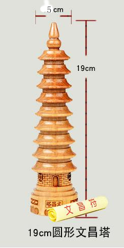 文昌塔:是我国古代传承下来的一种文人文化,它又称文笔塔和文峰塔,在很多文化名城常见。一般高七层、九层、十三层。相传文昌帝君是上界掌管文昌这神,所以我国古代书院往往在供奉孔子的同时,供奉文昌帝君。古人云:“商人供财神,官人念文昌。”文昌又名四绿文曲星,五行属木,用天然桃木宝材雕刻出来的文昌塔更有祥瑞之意,以起到“旺文启智,利学业,催官运。”