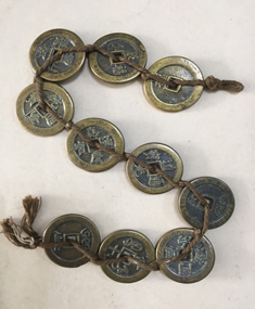 铜54《黄色十帝铜钱》大厚铜钱大绳串 宽3.5cm,厚0.3cm 一套(串)实价:53元