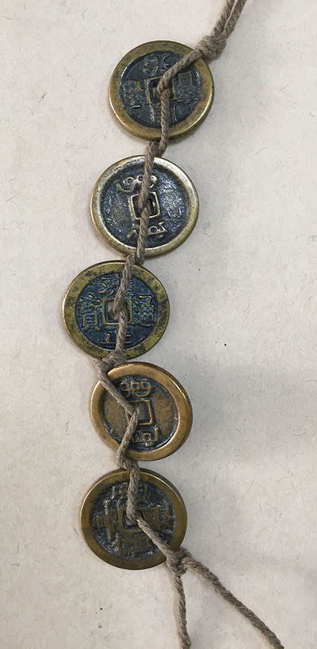 铜59《五帝钱黄色小铜钱》小绳串,宽2.6cm, 一套 实价 23元