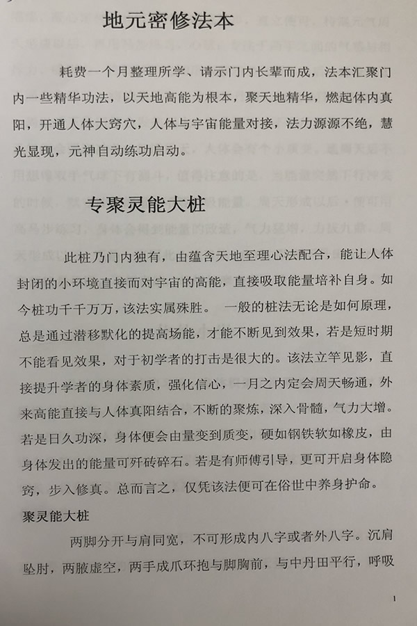 1、聚灵能大桩。此桩乃门内独有,由蕴含天地至理心法配合,能让人体封闭的小环境直接面对宇宙的高能,直接吸取能量培补自身。如今桩功千千万万,该法实属殊胜。该法立竿见影,直接提升学者得身体素质,强化信心,一月之内定会周天畅通,外来高能直接与人体真阳结合,不断的聚炼,深入骨髓,气力大增。若是有师傅引导,更可开启身体隐窍,步入修真。